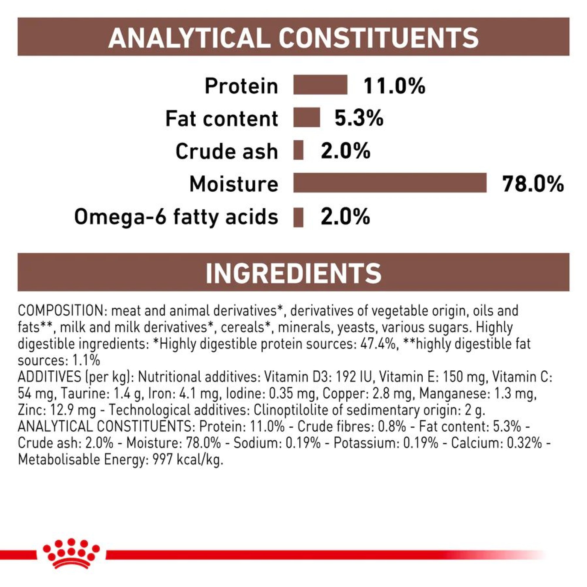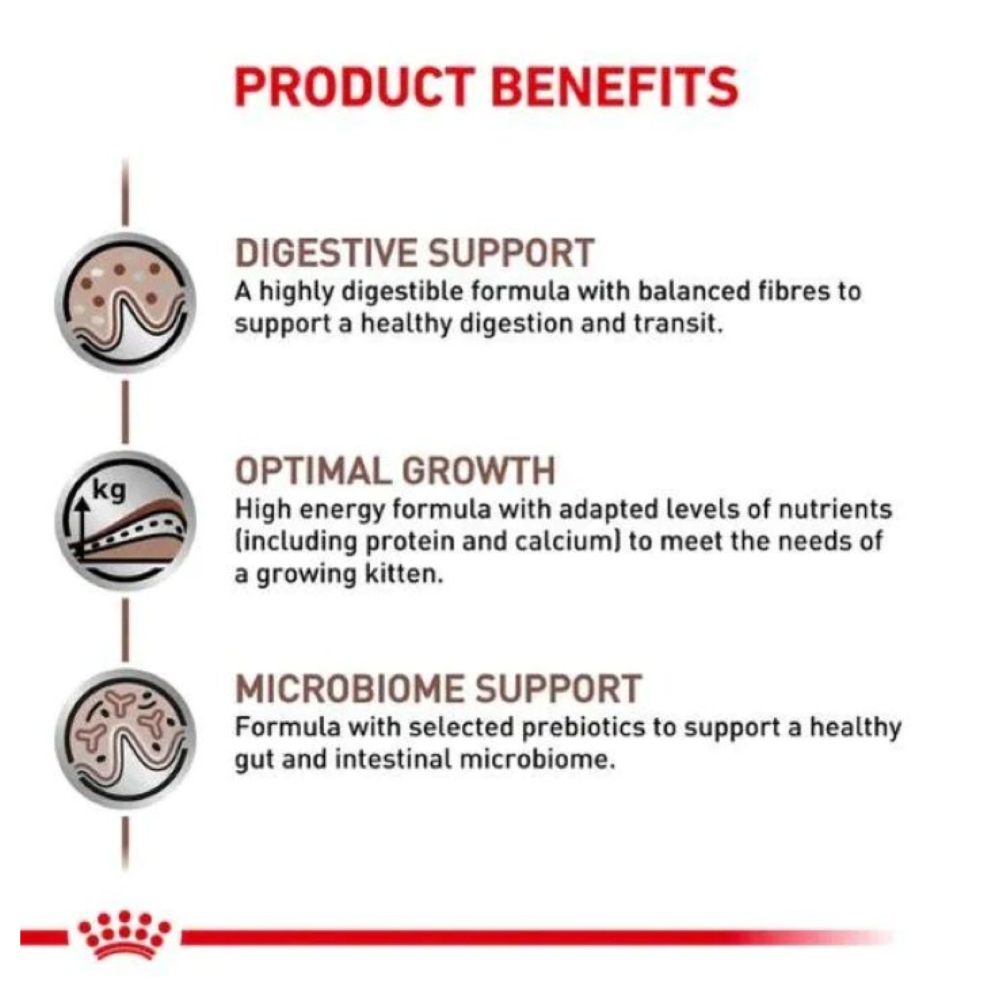 Η Royal Canin Cat GastroIntestinal Kitten αποτελεί μία πλήρης κλινική υγρή τροφή με κοτόπουλο και χοιρινό, για την ανήλικη, εγκυμονούσα ή θηλάζουσα γάτα, ειδικά σχεδιασμένη για την υποστήριξη της φυσιολογικής λειτουργίας του εντέρου. Παρασκευάζεται με μια εξαιρετικά εύπεπτη φόρμουλα με ισορροπημένες ίνες, η οποία περιλαμβάνει πρεβιοτικά, για την υποστήριξη της υγιούς πέψης και εντερικής λειτουργίας. Έχει υψηλό ενεργειακό περιεχόμενο με προσαρμοσμένα επίπεδα θρεπτικών ουσιών, συμπεριλαμβανομένων πρωτεϊνών και ασβεστίου, που καλύπτουν τις ανάγκες ανάπτυξης των νεαρών γατών. Η ειδική υφή μους διευκολύνει την πρόσληψη τροφής σε γατάκια με μειωμένη όρεξη καθώς και την μετάβαση από το γάλα στη στερεά τροφή.