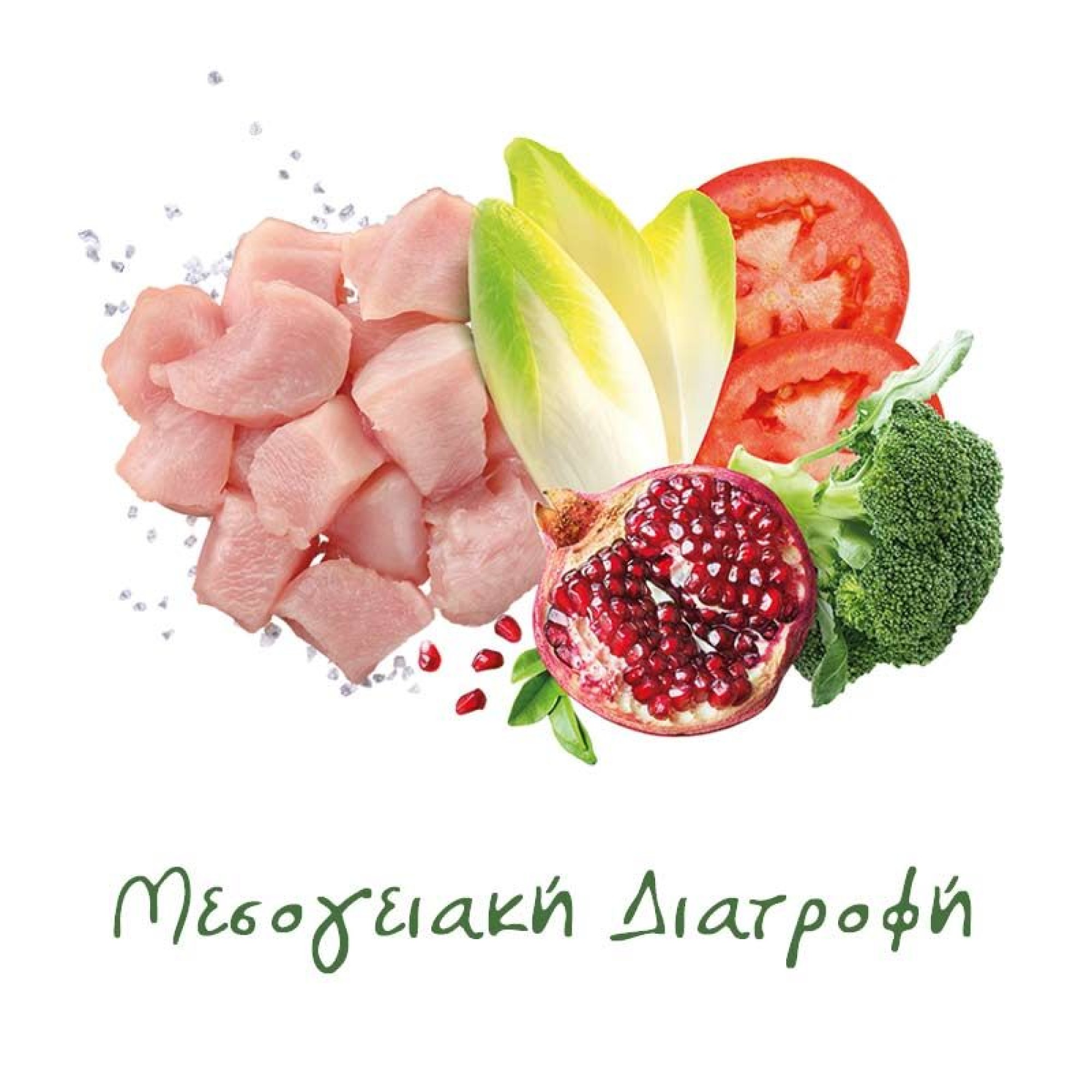 Η μονοπρωτεϊνική φόρμουλα Exclusion Mediterraneo – Noble Grain είναι μια πλήρης και ισορροπημένη τροφή, παρασκευασμένη με μία μόνο αφυδατωμένη πηγή ζωικής πρωτεΐνης, για μια καθαρή και ουσιαστική συνταγή και μόνο ένα υψηλής ποιότητας ευγενές δημητριακό. Είναι διατηρημένη με φυσικά αντιοξειδωτικά και ενσωματωμένη με βήτα-γλυκάνες. Είναι εμπλουτισμένη με μια καινοτόμο συνταγή υπερτροφών από τη μεσογειακή παράδοση: Κάνναβη, ελαιόλαδο, ντομάτα, ρόδι, μπρόκολο και ραδίκι. Δεν προστίθενται λίπος κοτόπουλου, σιτάρι, σόγια και καλαμπόκι.