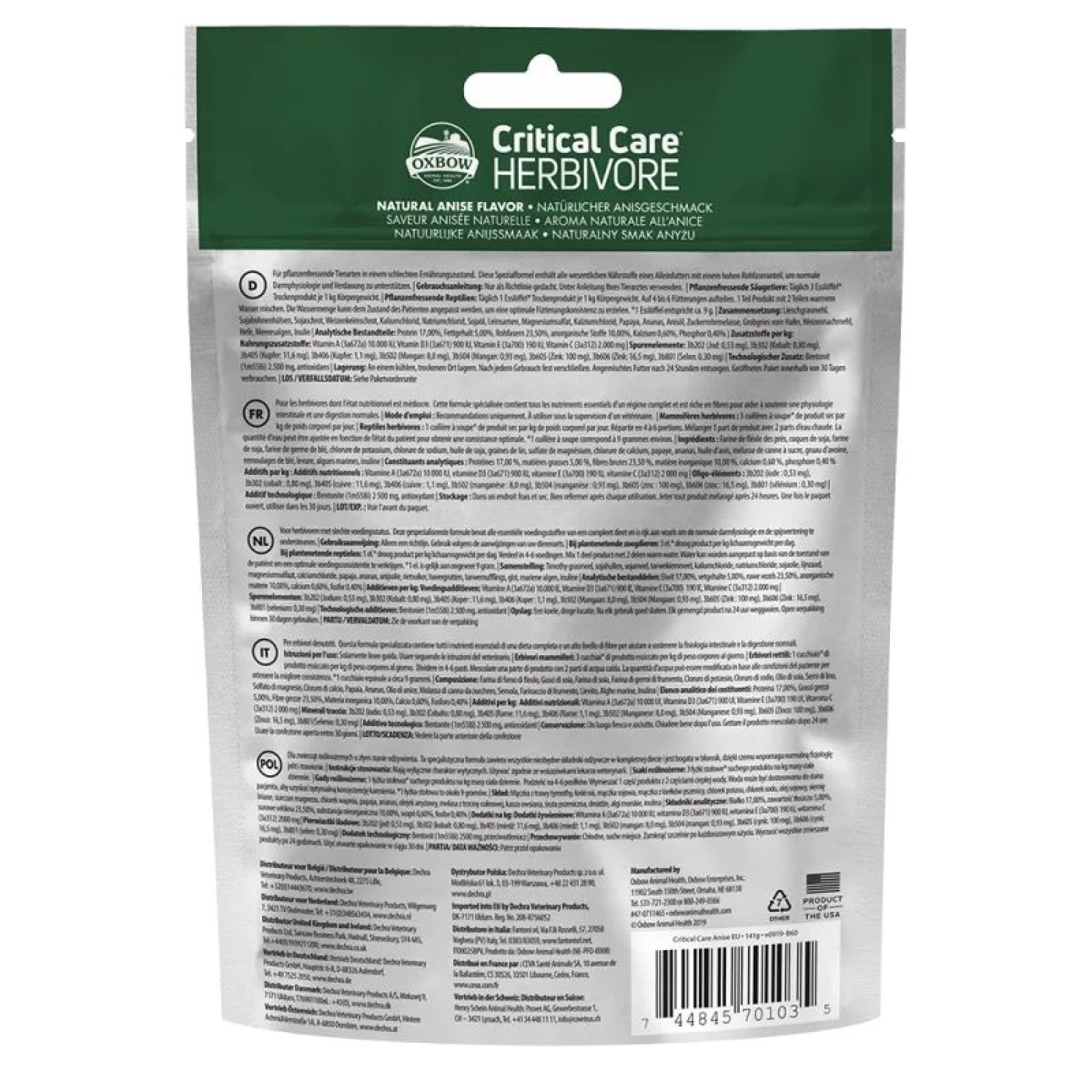 Το διατροφικό συμπλήρωμα της Oxbow Critical Care με γλυκάνισο αποτελεί μια εξαιρετική διατροφή αποθεραπείας, η οποία μπορεί να χορηγηθεί σε όλα τα φυτοφάγα κατοικίδια που βρίσκονται σε ανάρρωση.