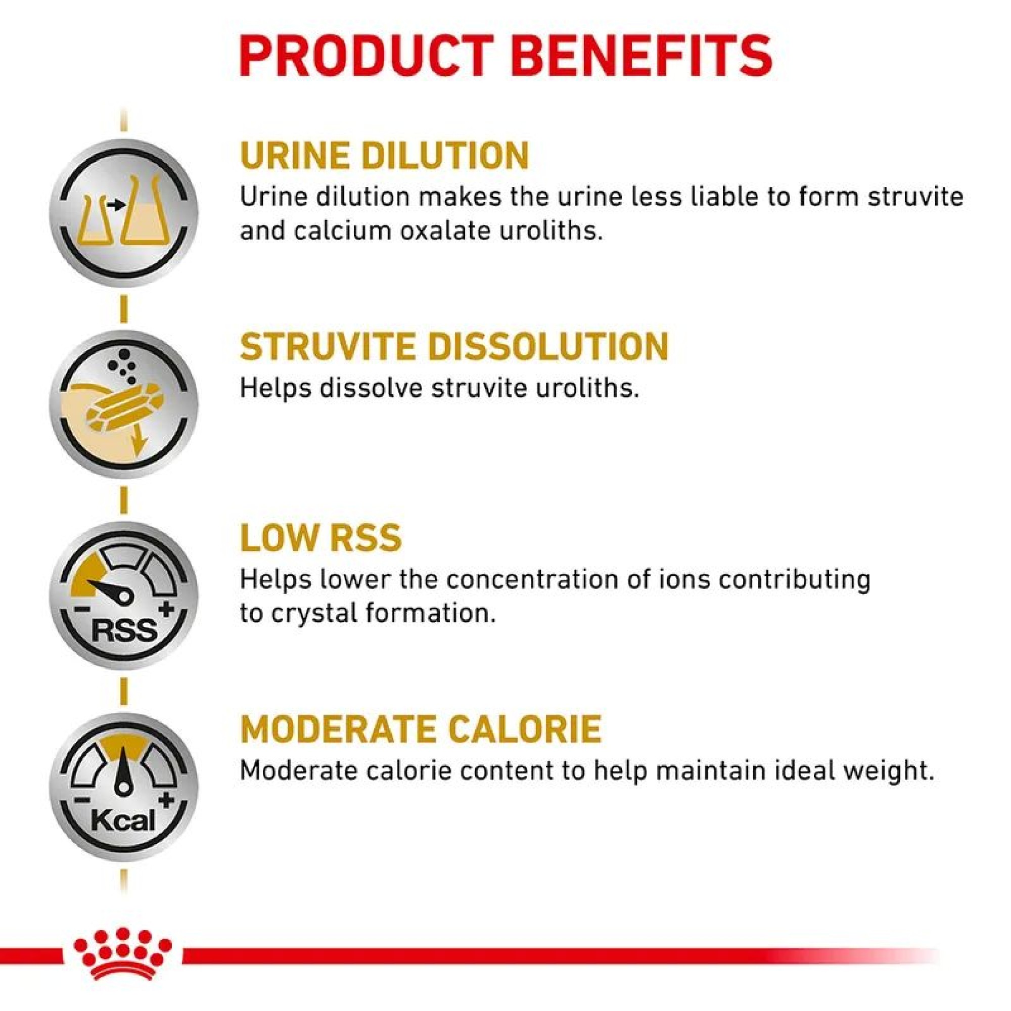 Η Royal Canin Urinary S/O Cat Moderate Calorie αποτελεί μία πλήρης κλινική υγρή τροφή με κομματάκια κρέας σε σάλτσα, ειδικά σχεδιασμένη για τη διάλυση των λίθων στρουβίτη, κατάλληλη για ενήλικες γάτες. Αυτή η τροφή συμβάλλει στην αποτελεσματική διάλυση των ουρόλιθων στρουβίτη και περιορίζει την επανεμφάνισή τους, χάρη στις ιδιότητες οξίνισης των ούρων, τη χαμηλή περιεκτικότητα σε μαγνήσιο και τη μειωμένη, αλλά υψηλής ποιότητας, περιεκτικότητα σε πρωτεΐνες. Παράλληλα, η αραίωση των ούρων δημιουργεί ένα περιβάλλον λιγότερο ευνοϊκό για το σχηματισμό λίθων στρουβίτη και οξαλικού ασβεστίου.Η μέτρια θερμιδική περιεκτικότητα την καθιστά ιδανική για γάτες που χρειάζονται διατήρηση του ιδανικού βάρους, όπως αυτές που είναι στειρωμένες, παχύσαρκες ή έχουν μειωμένη δραστηριότητα.