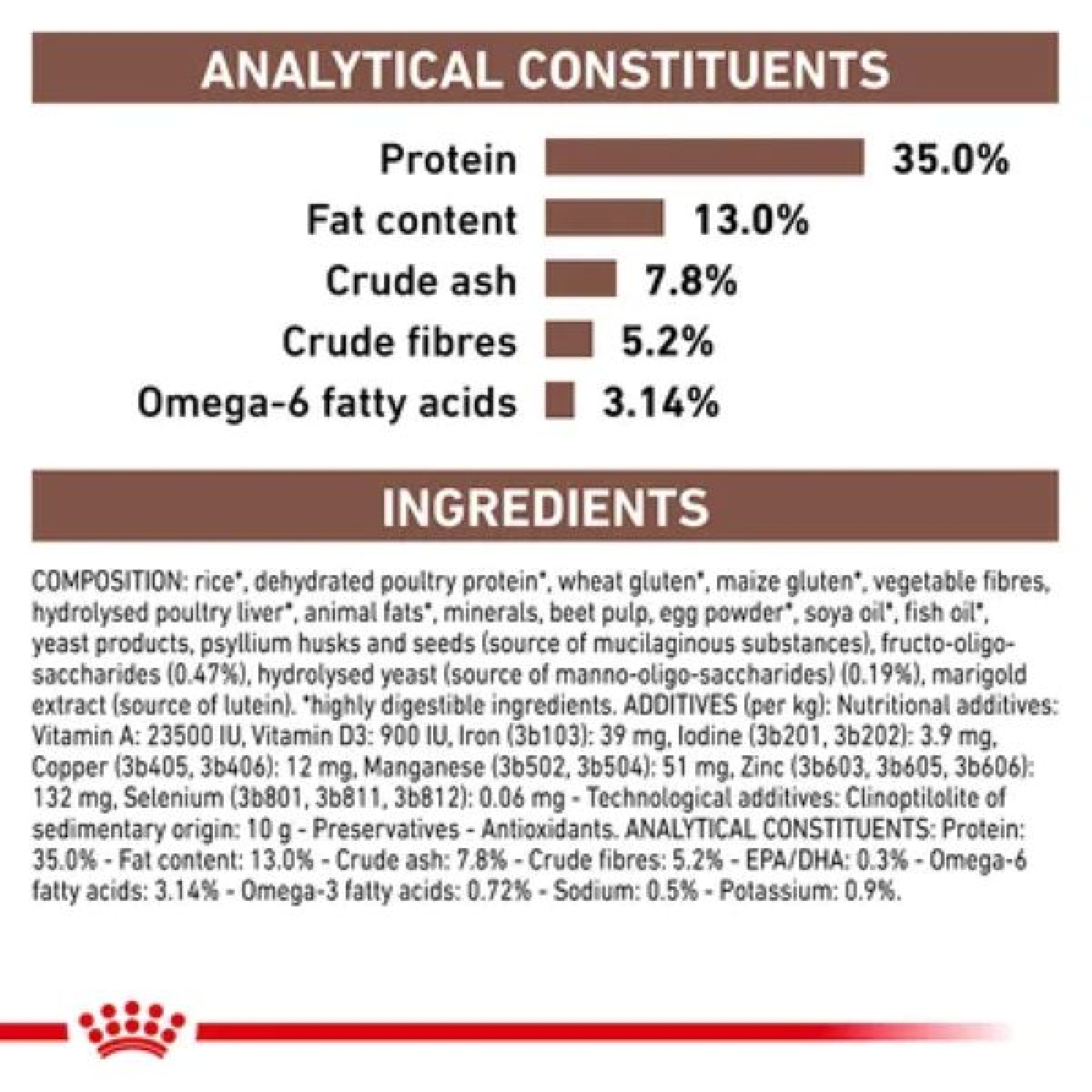 Πρωτεΐνη: 35,0% - Περιεκτικότητα σε λιπαρές ουσίες: 13,0% - Ανόργανη ύλη: 7,8% - Ακατέργαστες διατροφικές ίνες: 5,2% - EPA/DHA: 0,3% - Ω6 λιπαρά οξέα: 3,14% - Ω3 λιπαρά οξέα: 0,72% - Νάτριο: 0,5% - Κάλιο: 0,9%.