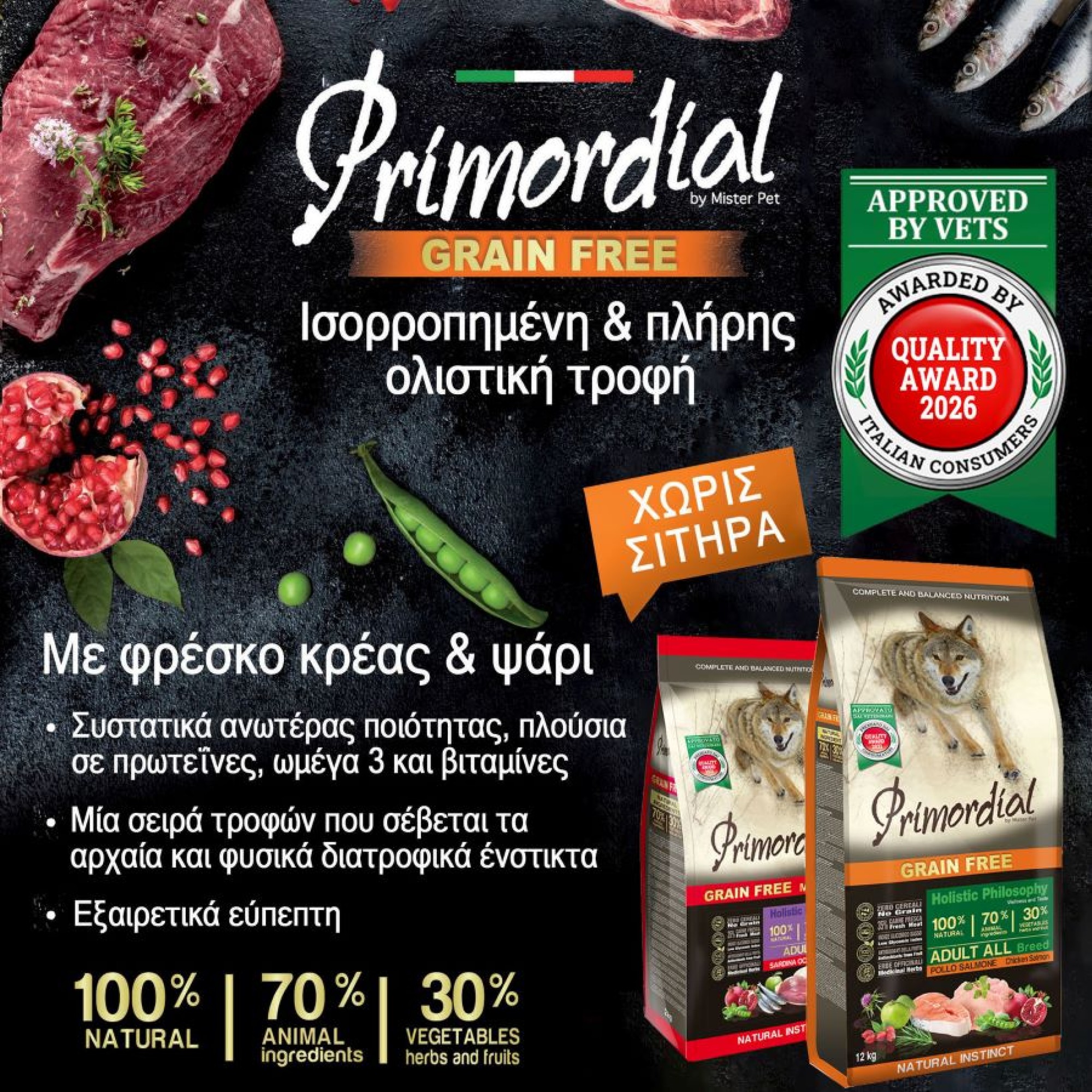 PRIMORDIAL GRAIN FREE HOLLISTIC ADULT DOG MINI BREEDS ΟΡΤΥΚΙ ΠΑΠΙΑ 2Kg