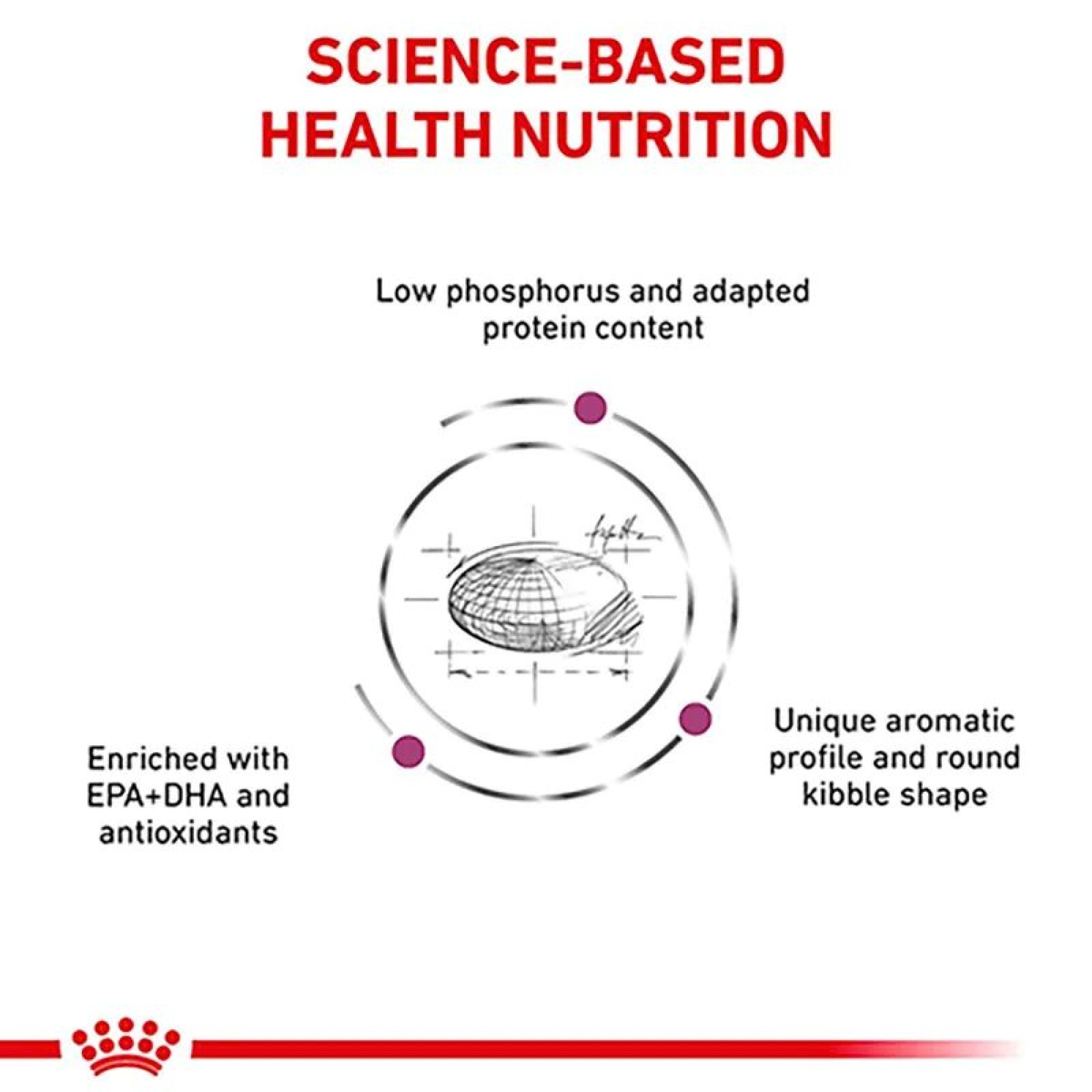 Η Royal Canin Renal αποτελεί μία πλήρης κλινική τροφή για ενήλικες γάτες με νεφρική ανεπάρκεια. Με ειδικά σχεδιασμένη σύνθεση χαμηλής περιεκτικότητας σε φωσφόρο και μέτρια σε πρωτεΐνη υψηλής ποιότητας, βοηθώντας στη βελτίωση της ποιότητας ζωής της γάτας σας. Έχει προσαρμοσμένη περιεκτικότητα σε ενέργεια για τη μείωση του όγκου του φαγητού, ενώ βοηθά στην αντιστάθμιση της μειωμένης όρεξης. Επιπλέον έχει ειδικό αρωματικό προφίλ και ειδικό μέγεθος κροκέτας που βοηθούν στη διέγερση της όρεξης, ιδίως σε περιπτώσεις αποστροφής στην τροφή.