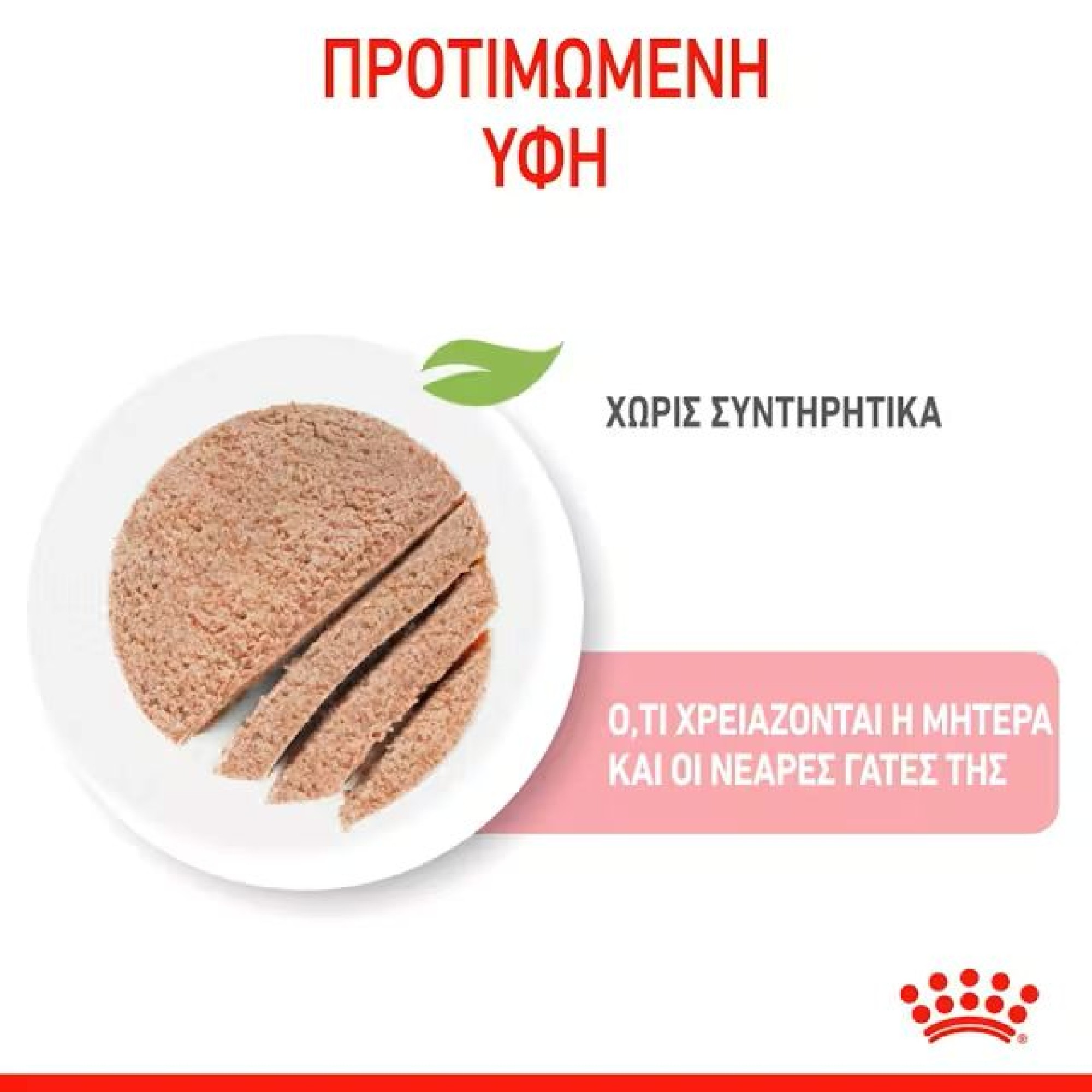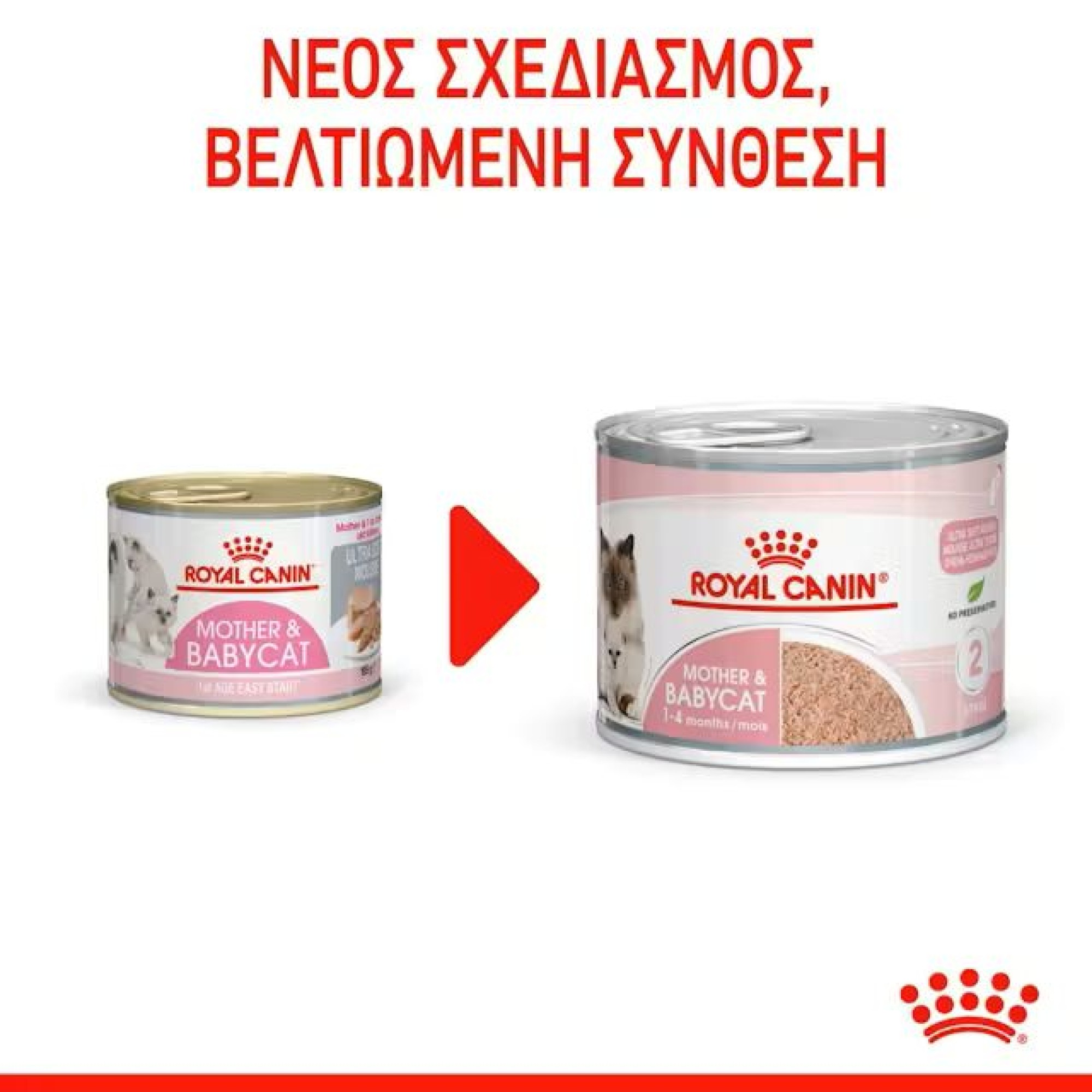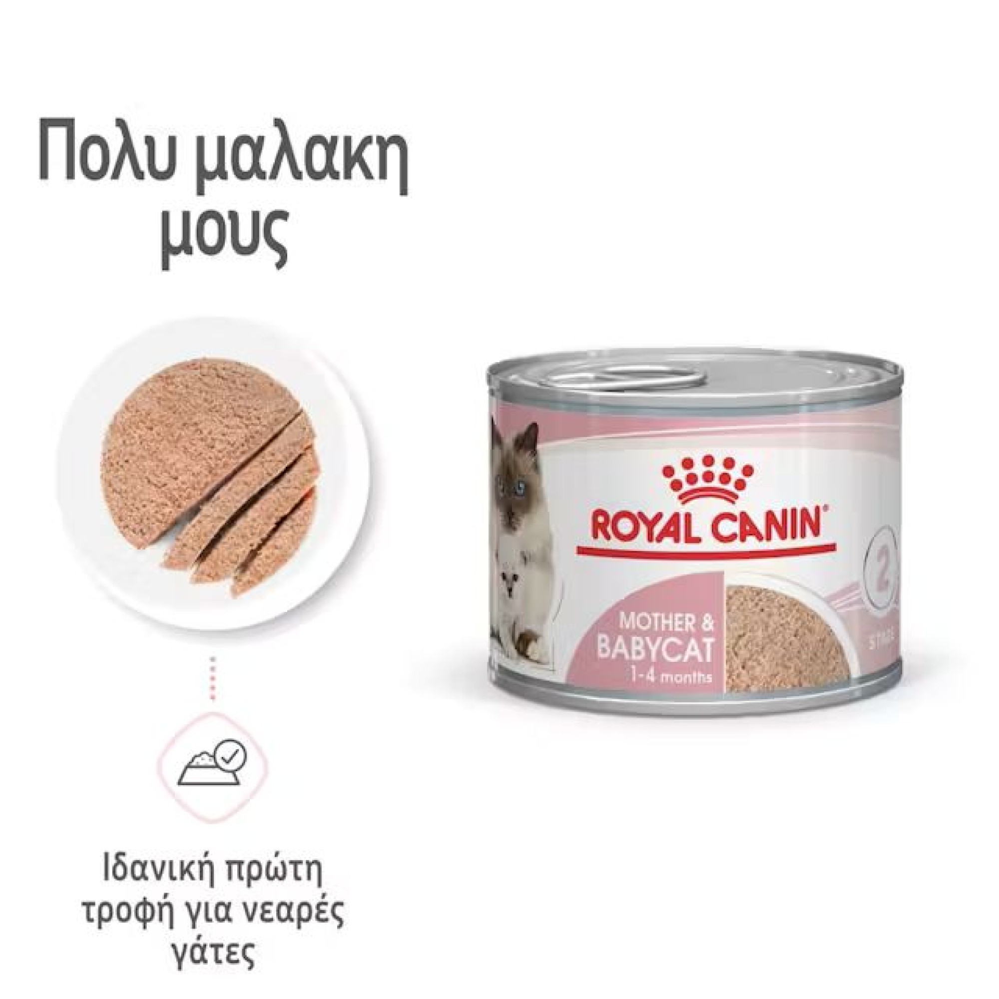 Η Ultra Soft Mousse ROYAL CANIN® Mother & Babycat είναι ειδικά προσαρμοσμένη για να καλύπτει τις υψηλές ενεργειακές ανάγκες της γάτας σας στο τέλος της κύησης και κατά τη διάρκεια της γαλουχίας. Είναι επίσης σχεδιασμένη για να έχει μια εύγευστη, απαλή υφή που είναι ιδανική για νεαρές γάτες που θηλάζουν ηλικίας έως 4 μηνών. Η Ultra Soft Mousse ROYAL CANIN® Mother & Babycat περιέχει ένα αποδεδειγμένο σύμπλεγμα που περιλαμβάνει βιταμίνες C και E για την υποστήριξη της υγιούς ανάπτυξης του ανοσοποιητικού συστήματος. Αυτή η φόρμουλα είναι εμπλουτισμένη με Ωμέγα-3 λιπαρά οξέα (DHA) για την υποστήριξη της ανάπτυξης του εγκεφάλου και την ενίσχυση της υγιούς όρασης σε νεαρές γάτες. Χάρη σε έναν συνδυασμό ωφέλιμων πρεβιοτικών (MOS) και εξαιρετικά εύπεπτων πρωτεϊνών, ηROYAL CANIN® Mother & Babycat Ultra Soft Mousse βοηθά επίσης στην υποστήριξη μιας υγιούς ισορροπίας της εντερικής μικροχλωρίδας (χλωρίδα του εντέρου) για καλή πέψη. Το Ultra Soft Mousse ROYAL CANIN® Mother & Babycat δεν είναι μόνο εύκολο για τις νεαρές γάτες κατά τον απογαλακτισμό, αλλά βοηθά στην παροχή της υγρασίας μέσω της τροφής στη θηλάζουσα μητέρα, που χρειάζεται για την παραγωγή γάλακτος. Στο σύντομο χρονικό διάστημα των 16 εβδομάδων, θα χρειαστούν μια δίαιτα που θα είναι ειδικά προσαρμοσμένη για να καλύπτει τις διατροφικές τους ανάγκες κατά την επόμενη φάση ανάπτυξης. Σε αυτό το στάδιο, μπορείτε να τα βοηθήσετε να μεταβούν σε δίαιτες ROYAL CANIN® KITTEN. Αυτή είναι διαθέσιμη ως ξηρή τροφής ή ως υγρή σε κομματάκια σε σάλτσα, ζελέ ή πατέ.
