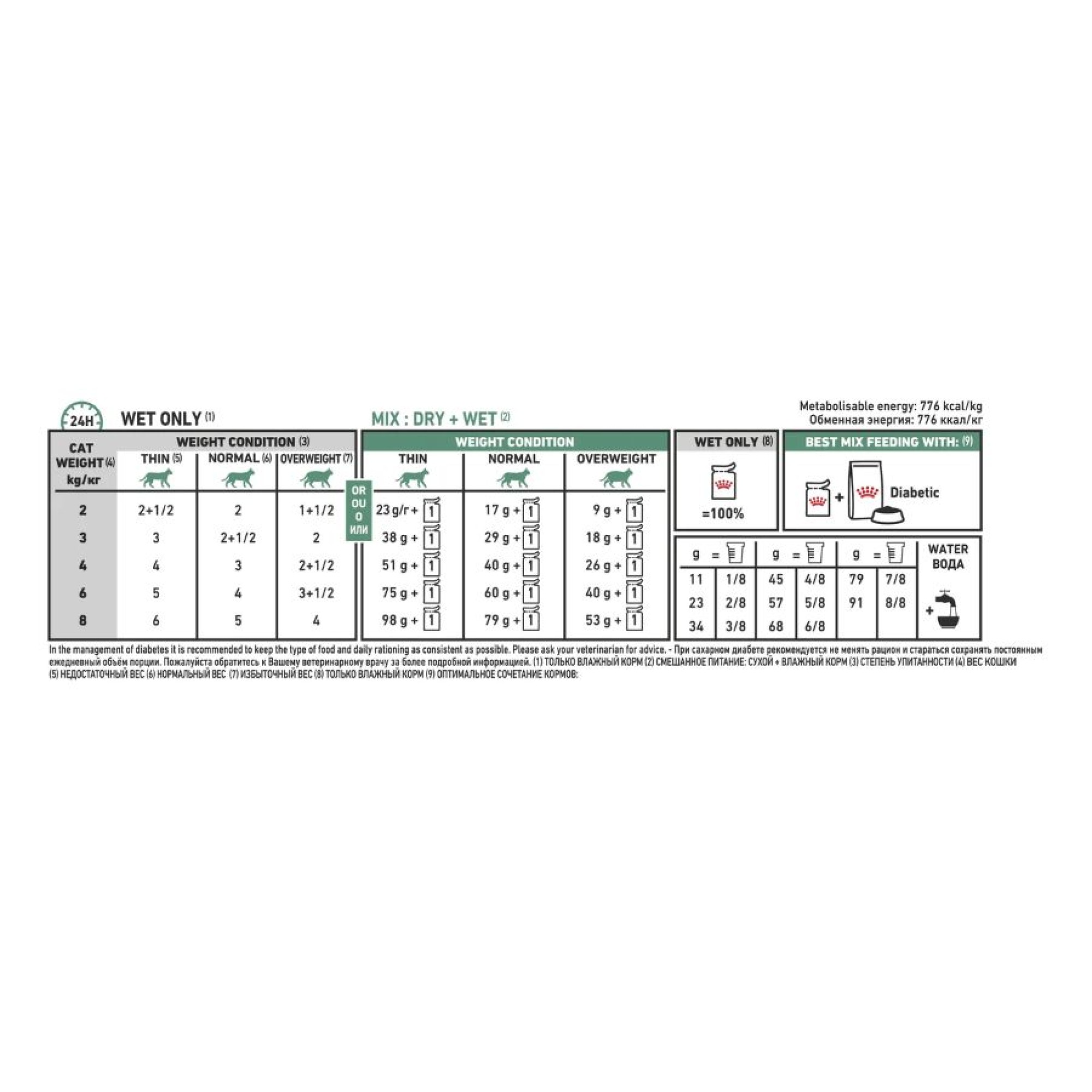 Η ROYAL CANIN® DIABETIC λεπτές φέτες σε σάλτσα είναι μια πλήρης διαιτητική τροφή για γάτες με σκοπό τη ρύθμιση της παροχής γλυκόζης (σακχαρώδης διαβήτης). Η τροφή αυτή έχει χαμηλή περιεκτικότητα σε ταχέως διασπώμενους προς γλυκόζη υδατάνθρακες.