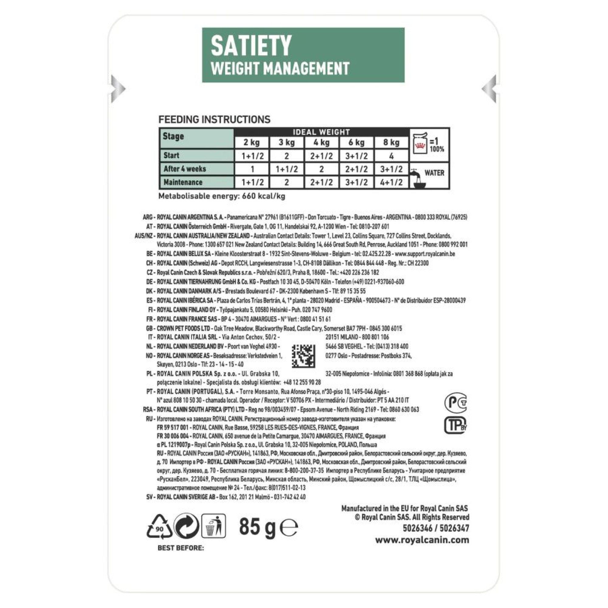 Η ROYAL CANIN ® SATIETY WEIGHT MANAGEMENT λεπτές φέτες σε σάλτσα είναι μια πλήρης διαιτητική τροφή για γάτες με σκοπό τη μείωση του υπερβολικού βάρους.Η τροφή αυτή έχει χαμηλό ενεργειακό περιεχόμενο.