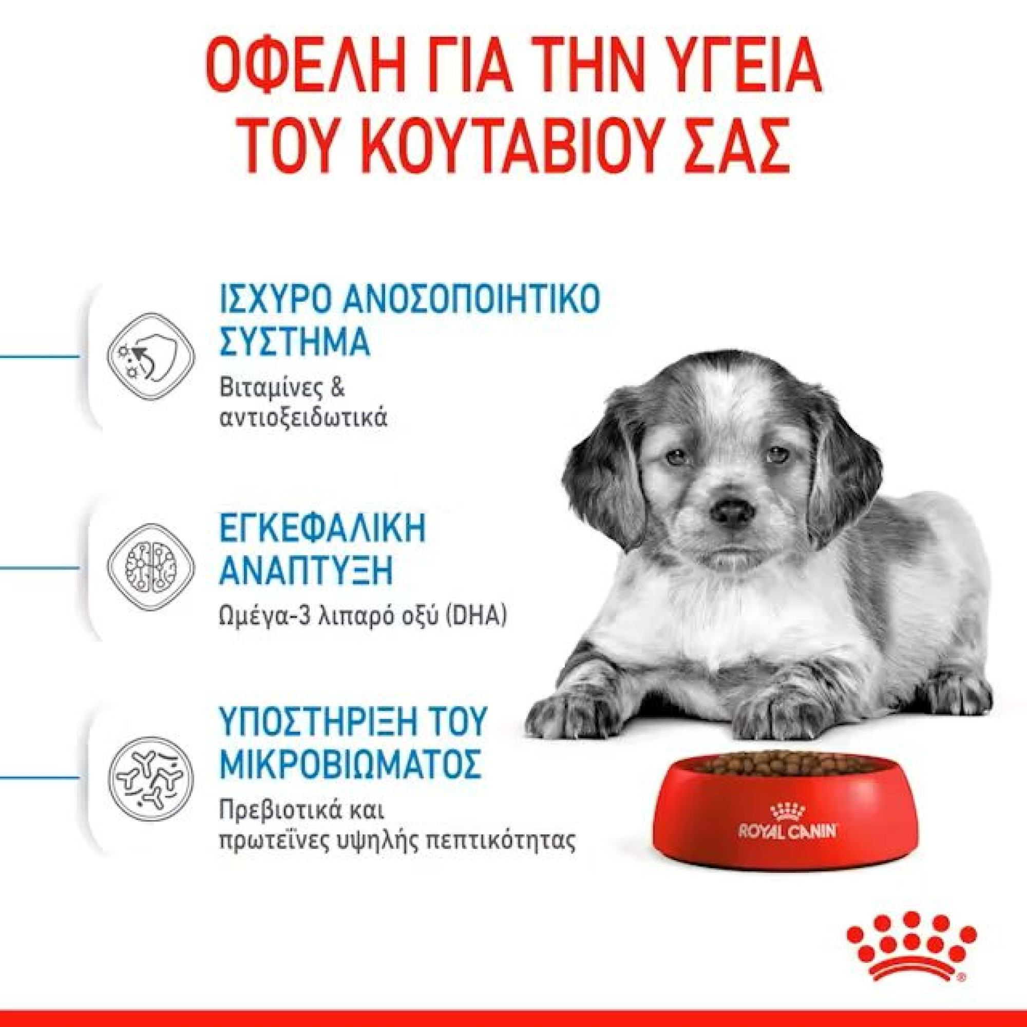 Η ROYAL CANIN® Medium Puppy είναι ειδικά σχεδιασμένη για να υποστηρίζει τις διατροφικές ανάγκες κουταβιών μεσαίου μεγέθους . Αυτή η φόρμουλα είναι κατάλληλη για κουτάβια από 2 έως 12 μηνών που θα πρέπει να φτάσουν σε ενήλικο βάρος 11-25 κιλά. Αυτή η προσαρμοσμένη δίαιτα περιέχει θρεπτικά συστατικά όπως βιταμίνη C και Ε, τα οποία αποδεδειγμένα υποστηρίζουν την ανάπτυξη του υγιούς ανοσοποιητικού συστήματος ενός κουταβιού. Είναι εμπλουτισμένο με ωμέγα-3 λιπαρά οξέα (όπως το DHA) που έχει αποδειχθεί επιστημονικά ότι βοηθούν στην υποστήριξη της υγιούς ανάπτυξης του εγκεφάλου στα κουτάβια. Ένας συνδυασμός ωφέλιμων πρεβιοτικών (όπως FOS, MOS και πολτός τεύτλων) και εξαιρετικά εύπεπτων πρωτεϊνών συμβάλλει στην υποστήριξη μιας υγιούς ισορροπίας της εντερικής μικροχλωρίδας (χλωρίδα του εντέρου) για καλή πέψη. Η φόρμουλα περιέχει επίσης ένα βέλτιστο ενεργειακό περιεχόμενο που έχει σχεδιαστεί για να ικανοποιεί τις ενεργειακές ανάγκες των αναπτυσσόμενων κουταβιών, μεσαίου μεγέθους . Η κροκέτα στο ROYAL CANIN® Medium Puppy έχει σχεδιαστεί ώστε να είναι αρκετά μεγάλη ώστε να αποθαρρύνει την γρήγορη κατανάλωση, αλλά όχι τόσο μεγάλη ώστε ένα κουτάβι να διστάζει να φάει. Ένα μηχανικό αποτέλεσμα βουρτσίσματος επιτυγχάνεται που βοηθά στην υποστήριξη της οδοντικής υγείας καθώς το κουτάβι σας μασάει την τροφή του. Όταν το κουτάβι σας φτάσει τους 12 μήνες, θα χρειαστεί μια δίαιτα που να είναι ειδικά προσαρμοσμένη για να καλύψει τις διατροφικές του ανάγκες ως ενήλικος σκύλος. Σε αυτό το στάδιο, μπορείτε να το βοηθήσετε να μεταβεί στο ROYAL CANIN® Medium Adult, διαθέσιμο είτε σε ξηρή τροφή είτε σε κομμάτια σε σάλτσα, σε υγρή μορφή.