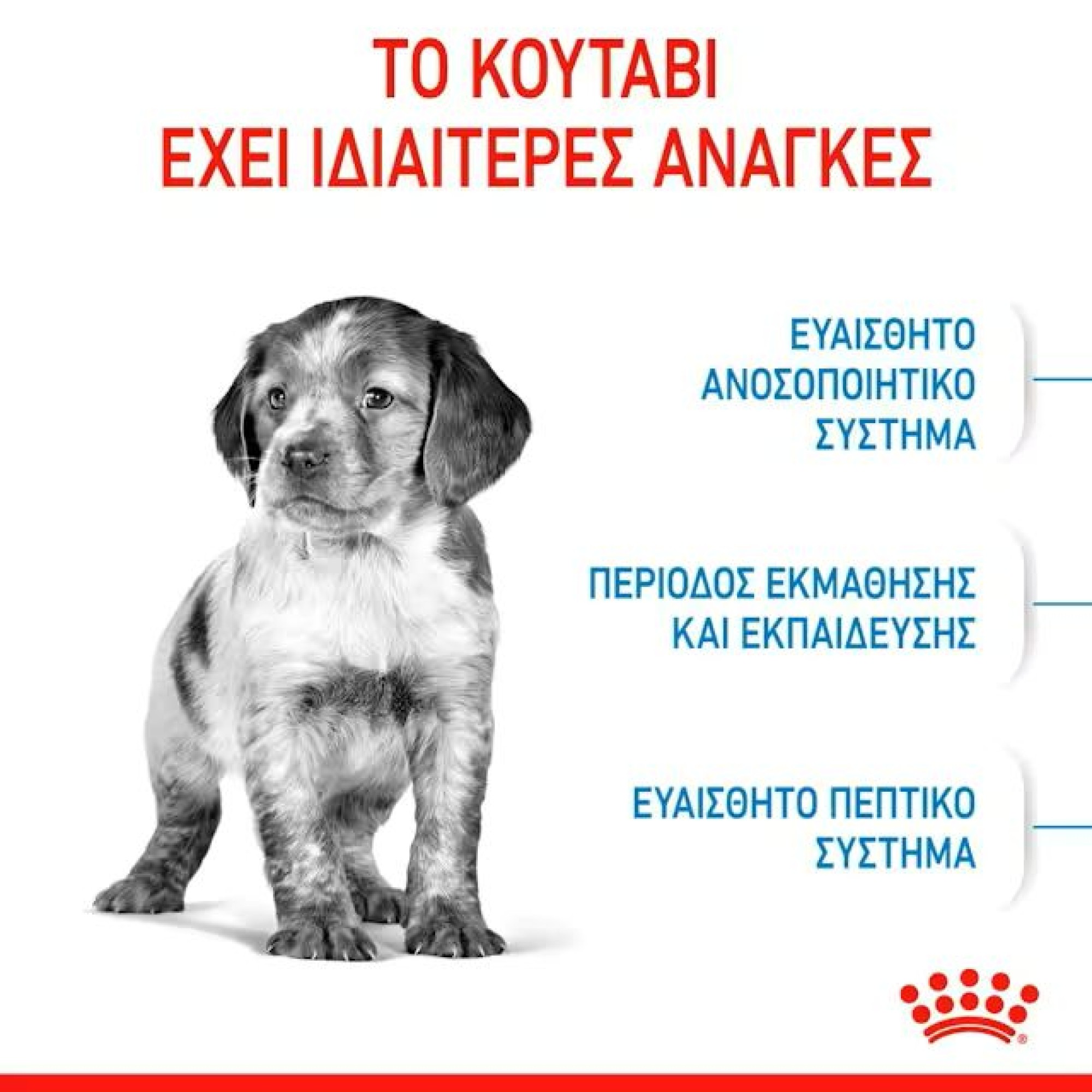 Η ROYAL CANIN® Medium Puppy είναι ειδικά σχεδιασμένη για να υποστηρίζει τις διατροφικές ανάγκες κουταβιών μεσαίου μεγέθους . Αυτή η φόρμουλα είναι κατάλληλη για κουτάβια από 2 έως 12 μηνών που θα πρέπει να φτάσουν σε ενήλικο βάρος 11-25 κιλά. Αυτή η προσαρμοσμένη δίαιτα περιέχει θρεπτικά συστατικά όπως βιταμίνη C και Ε, τα οποία αποδεδειγμένα υποστηρίζουν την ανάπτυξη του υγιούς ανοσοποιητικού συστήματος ενός κουταβιού. Είναι εμπλουτισμένο με ωμέγα-3 λιπαρά οξέα (όπως το DHA) που έχει αποδειχθεί επιστημονικά ότι βοηθούν στην υποστήριξη της υγιούς ανάπτυξης του εγκεφάλου στα κουτάβια. Ένας συνδυασμός ωφέλιμων πρεβιοτικών (όπως FOS, MOS και πολτός τεύτλων) και εξαιρετικά εύπεπτων πρωτεϊνών συμβάλλει στην υποστήριξη μιας υγιούς ισορροπίας της εντερικής μικροχλωρίδας (χλωρίδα του εντέρου) για καλή πέψη. Η φόρμουλα περιέχει επίσης ένα βέλτιστο ενεργειακό περιεχόμενο που έχει σχεδιαστεί για να ικανοποιεί τις ενεργειακές ανάγκες των αναπτυσσόμενων κουταβιών, μεσαίου μεγέθους . Η κροκέτα στο ROYAL CANIN® Medium Puppy έχει σχεδιαστεί ώστε να είναι αρκετά μεγάλη ώστε να αποθαρρύνει την γρήγορη κατανάλωση, αλλά όχι τόσο μεγάλη ώστε ένα κουτάβι να διστάζει να φάει. Ένα μηχανικό αποτέλεσμα βουρτσίσματος επιτυγχάνεται που βοηθά στην υποστήριξη της οδοντικής υγείας καθώς το κουτάβι σας μασάει την τροφή του. Όταν το κουτάβι σας φτάσει τους 12 μήνες, θα χρειαστεί μια δίαιτα που να είναι ειδικά προσαρμοσμένη για να καλύψει τις διατροφικές του ανάγκες ως ενήλικος σκύλος. Σε αυτό το στάδιο, μπορείτε να το βοηθήσετε να μεταβεί στο ROYAL CANIN® Medium Adult, διαθέσιμο είτε σε ξηρή τροφή είτε σε κομμάτια σε σάλτσα, σε υγρή μορφή.