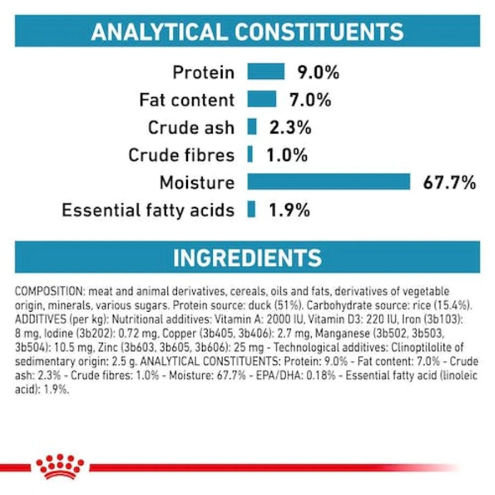 Κρέατα και υποπροϊόντα ζώων, Σιτηρά, Έλαια και λίπη, Υποπροϊόντα φυτικής προελεύσεως, Ανόργανα συστατικά σάκχαρα. Πηγή πρωτεϊνών: πάπια (53%). Πηγή υδατανθράκων: ρύζι (15%).