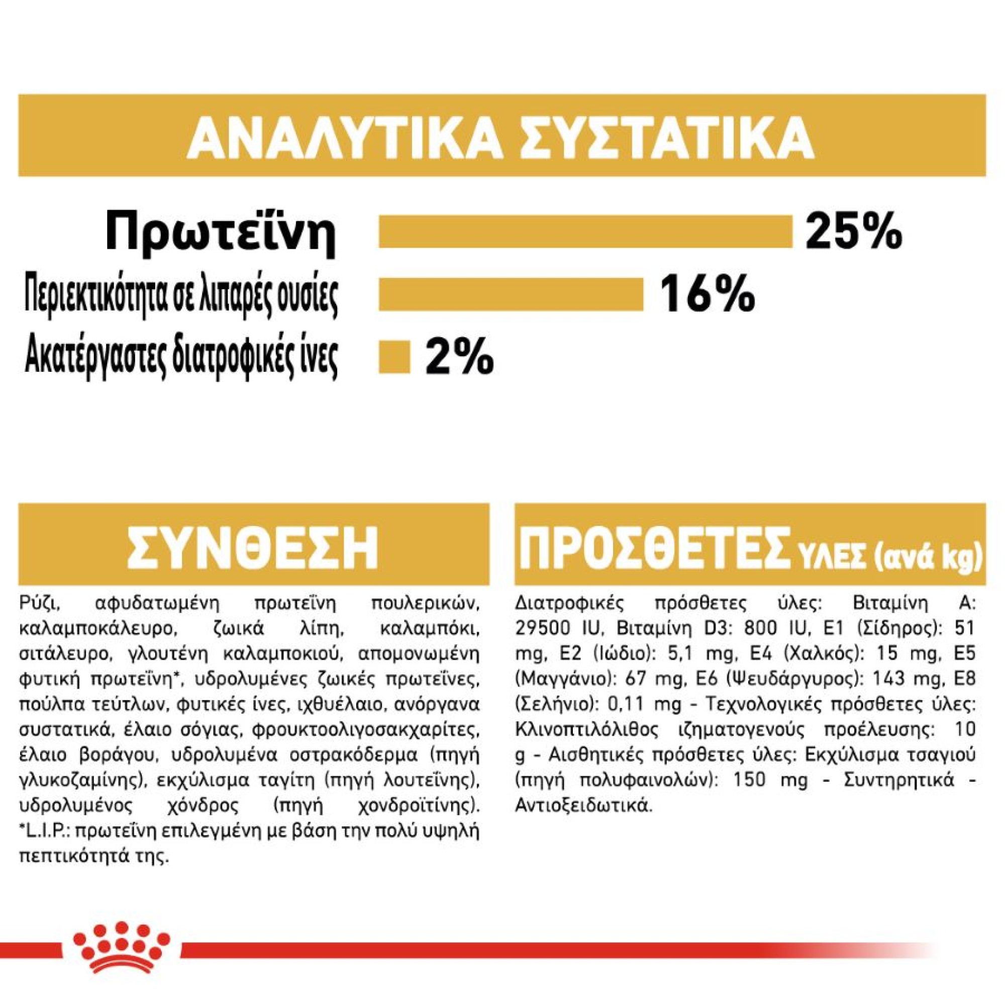 Pύζι, αφυδατωμένη πρωτεΐνη πουλερικών, αλεύρι αραβοσίτου, ζωικά λίπη, αραβόσιτο, αλεύρι σίτου, γλουτένη αραβοσίτου, απομονωμένη φυτική πρωτεΐνη *, υδρολυμένες ζωικές πρωτεΐνες, πολτός τεύτλων, φυτικές ίνες, ιχθυέλαιο, ανόργανα άλατα, έλαιο σόγιας, φρουκτολιγοσακχαρίτες, πετρέλαιο, υδρολυμένα καρκινοειδή (πηγή γλυκοζαμίνης), εκχύλισμα καρυδιού (πηγή λουτεΐνης), υδρολυμένο χόνδρο (πηγή χονδροϊτίνης).