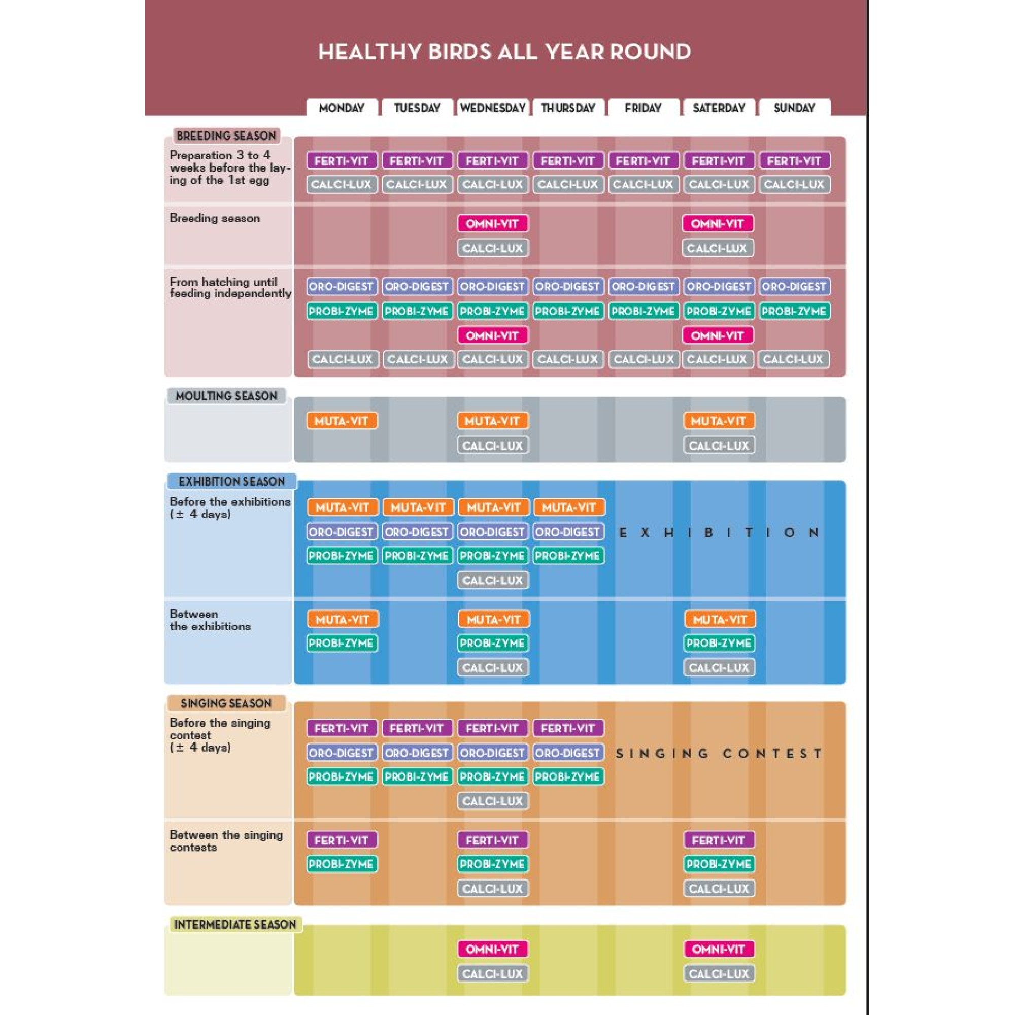 - Κατά την προετοιμασία για την αναπαραγωγική περίοδο (3 έως 4 εβδομάδες) μέχρι την ωοτοκία του πρώτου αυγού: χορηγήστε καθημερινά.