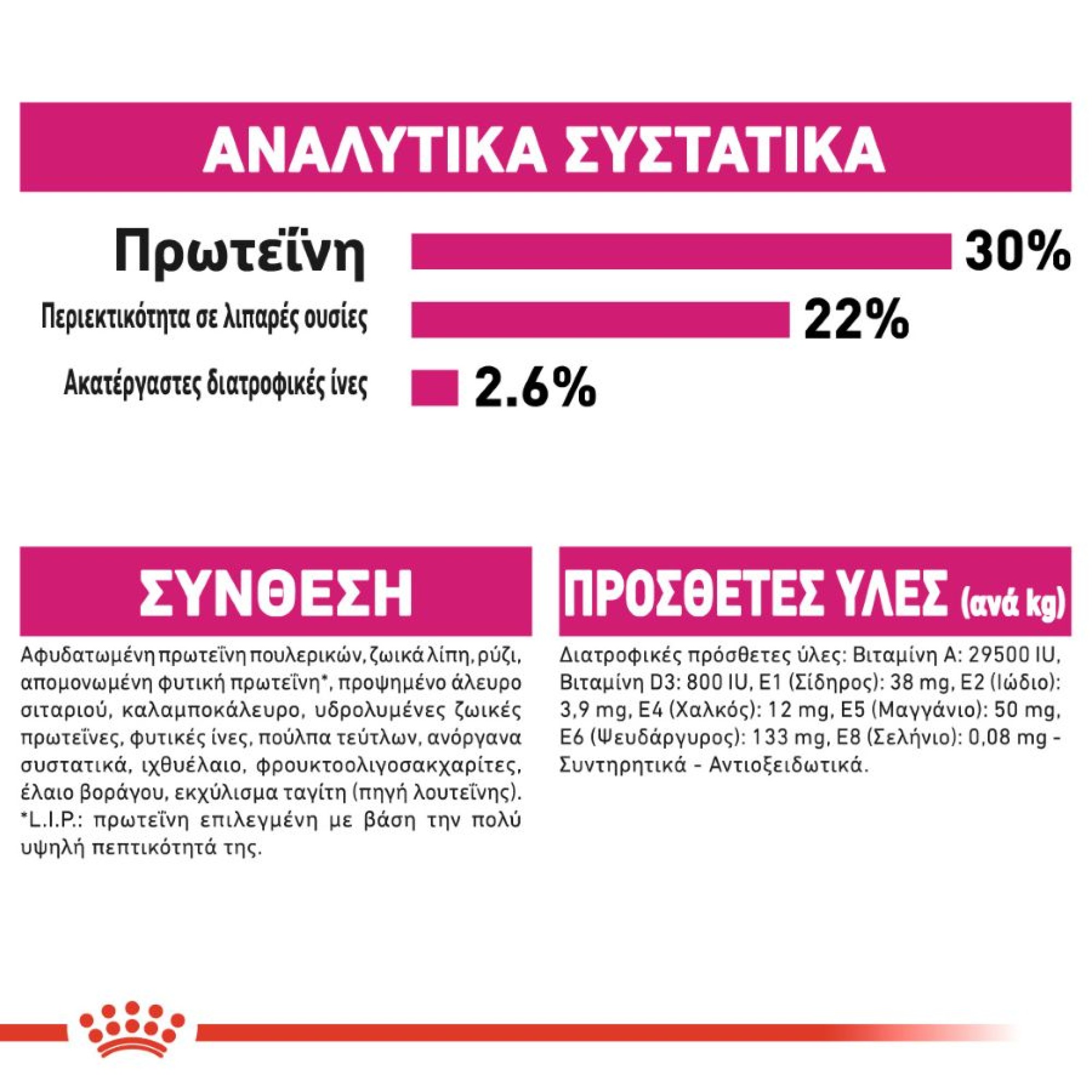 Aφυδατωμένη πρωτεΐνη πουλερικών, ζωικά λίπη, ρύζι, απομονωμένη φυτική πρωτεϊνη*, αλεύρι αραβοσίτου, υδρολυμένες ζωικές πρωτεΐνες, φυτικές ίνες, πολτός τεύτλων, ανόργανα συστατικά, ιχθυέλαιο, φρουκτο-ολιγοσακχαρίτες, πηγή της λουτεΐνης).