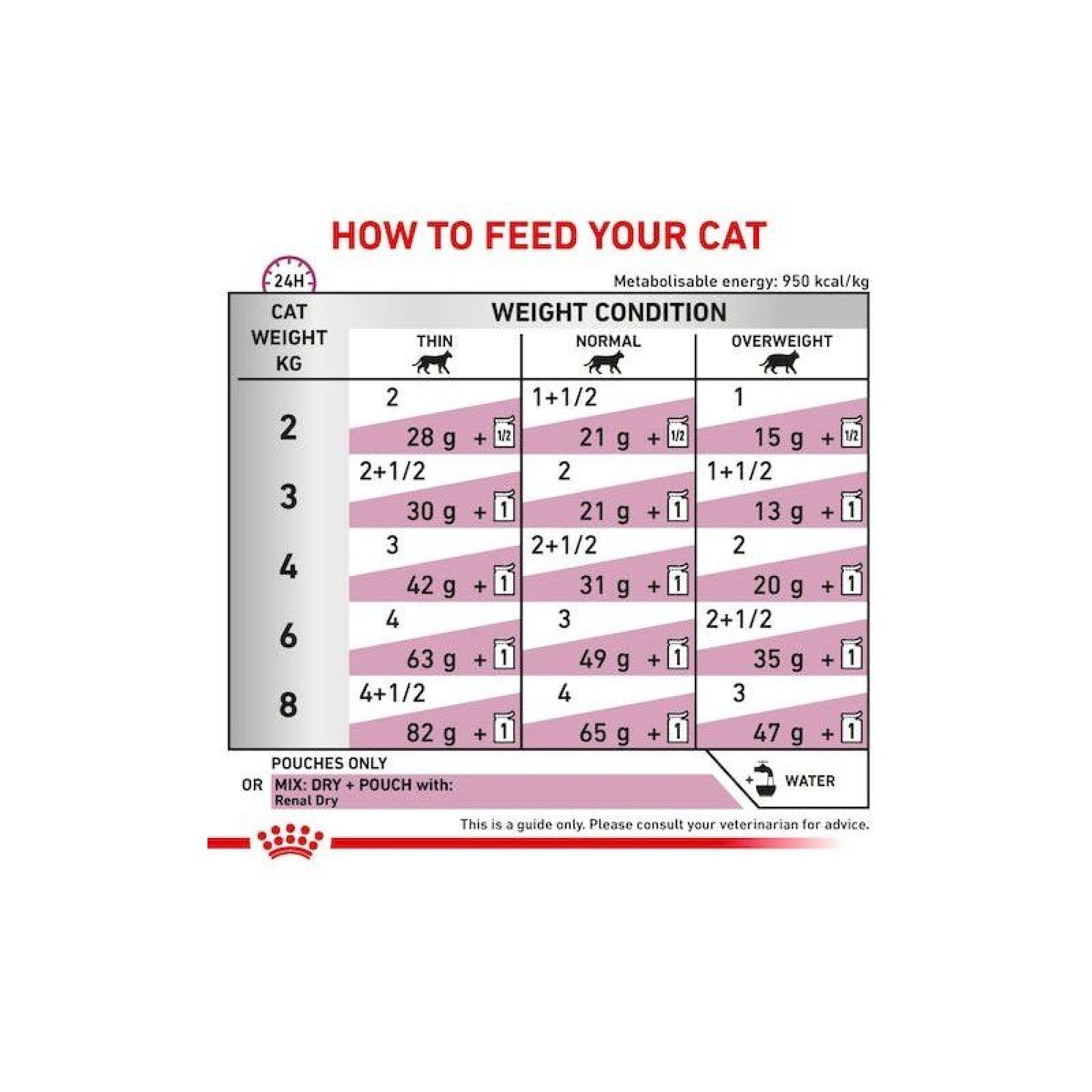 Η Royal Canin Renal Cat με Κοτόπουλο αποτελεί μία πλήρης κλινική υγρή τροφή με κομμάτια κοτόπουλου σε σάλτσα, για ενήλικες και ηλικιωμένες γάτες με νεφρική ανεπάρκεια. Η τροφή αυτή έχει ειδικά σχεδιασμένη σύνθεση με χαμηλή περιεκτικότητα σε φωσφόρο και μέτρια σε πρωτεΐνη υψηλής ποιότητας, βοηθώντας στη βελτίωση της ποιότητας ζωής της γάτας σας. Έχει προσαρμοσμένη περιεκτικότητα σε ενέργεια για τη μείωση του όγκου του φαγητού, ενώ βοηθά στην αντιστάθμιση της μειωμένης όρεξης, και ειδικό αρωματικό προφίλ που βοηθά στη διέγερση της όρεξης, ιδίως σε περιπτώσεις αποστροφής στην τροφή. Επίσης, χάρη στη χαμηλή περιεκτικότητά της σε ασβέστιο και βιταμίνη D και τις ιδιότητές της αλκαλοποίησης των ούρων βοηθά στον περιορισμό του σχηματισμού λίθων από άλατα του οξαλικού οξέος.
