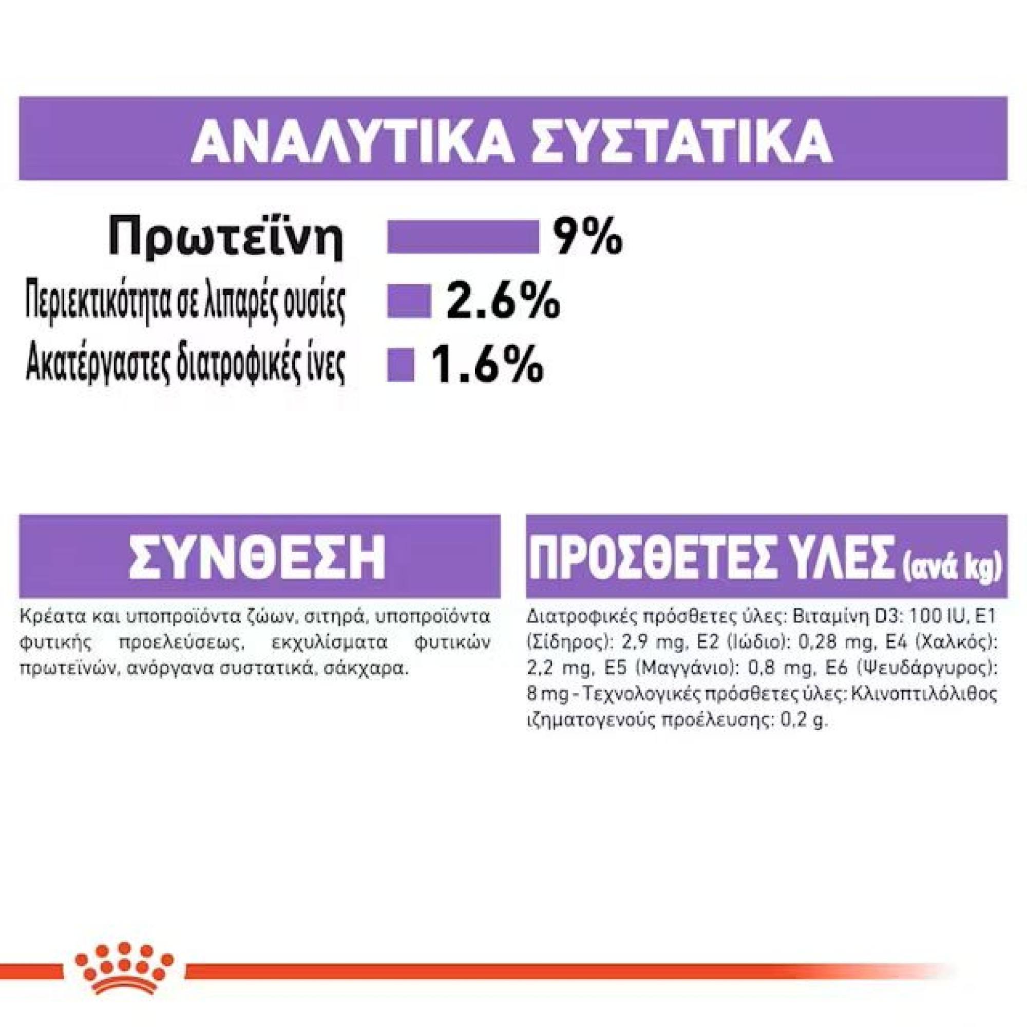 Όταν οι γάτες στειρώνονται, οι διατροφικές τους ανάγκες αλλάζουν σε σύγκριση με τις γάτες που δεν έχουν στειρωθεί. Ως αποτέλεσμα της στείρωσης, η γάτα σας θα έχει χαμηλότερες ενεργειακές ανάγκες και θα μπορούσε να είναι λιγότερο δραστήρια. Με ένα ελεγχόμενο ενεργειακό περιεχόμενο και ένα μέτριο επίπεδο λίπους, το ROYAL CANIN® Sterilised σε ζελέ βοηθά στην υποστήριξη και διατήρηση ενός υγιούς βάρους. Το ROYAL CANIN® Sterilized in Jelly είναι σχεδιασμένο για να ταιριάζει με το βέλτιστο θρεπτικό προφίλ που προτιμάται ενστικτωδώς από ενήλικες γάτες. Αυτό εξασφαλίζει ότι η γάτα σας θα καταναλώνει εύκολα τα θρεπτικά συστατικά που χρειάζεται για να διατηρήσει καλή γενική υγεία. Το ROYAL CANIN® Sterilized in Jelly περιέχει επίσης μια προσεκτικά εξεταζόμενη ισορροπία ανόργανων αλάτων που βοηθά στη στήριξη της υγείας του ουροποιητικού συστήματος της γάτας σας. Για να ικανοποιήσει τις προτιμήσεις κάθε γάτας, το ROYAL CANIN® Sterilized είναι επίσης διαθέσιμο σε υγρή τροφή σε νόστιμη σάλτσα ή σε ένα μαλακό και νόστιμο πατέ και σαν ξηρά τροφή σε νόστιμες και τραγανές κροκέτες. Εάν σκέφτεστε να κάνετε μεικτή σίτιση, ακολουθήστε τις οδηγίες μας για τη διατροφή της γάτας σας για να διασφαλίσετε ότι λαμβάνει μια ακριβή ποσότητα τόσο υγρής όσο και ξηρής τροφής για βέλτιστο όφελος.