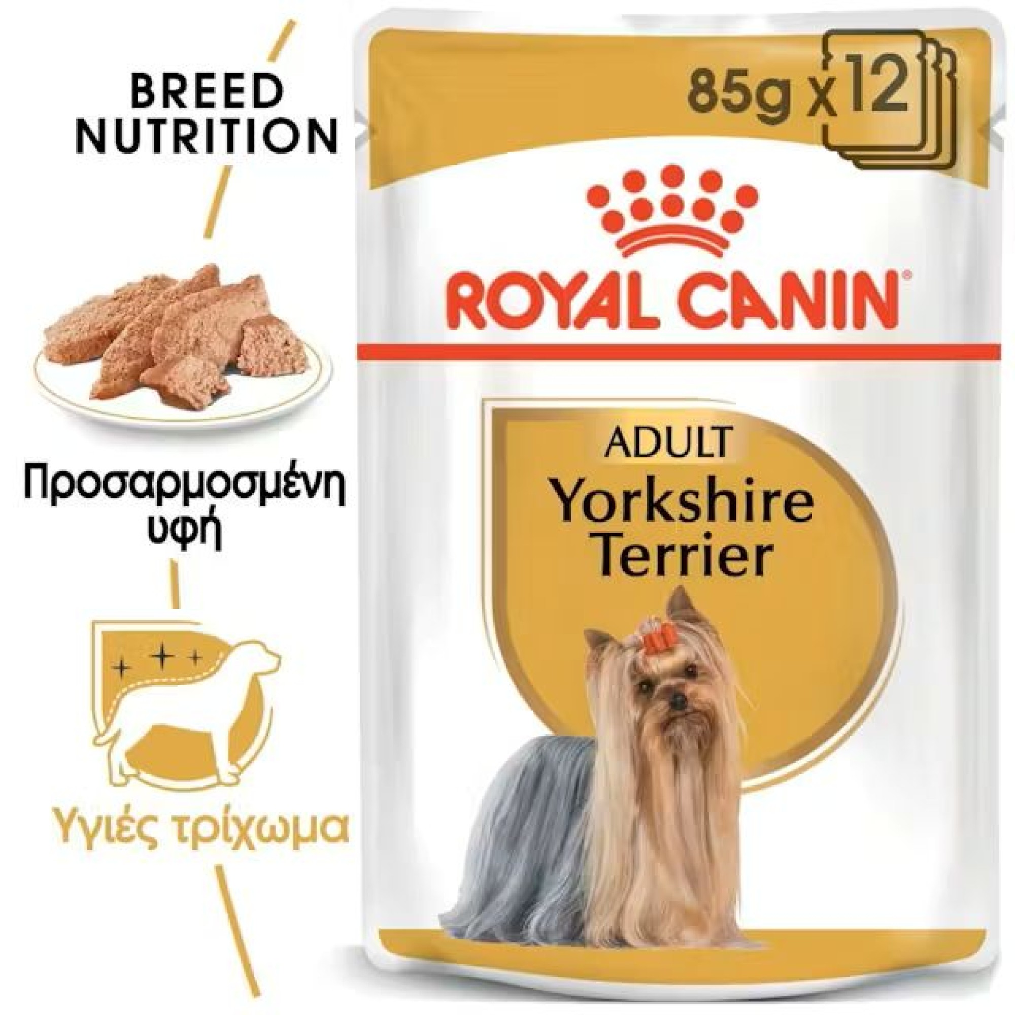 Κατάλληλο για Yorkshire Terrier άνω των 10 μηνών, η ROYAL CANIN® Yorkshire Terrier πατέ είναι ειδικά σχεδιασμένη με γνώμονα όλες τις διατροφικές ανάγκες του ενήλικου σκύλου σας. Η ROYAL CANIN® Yorkshire Terrier πατέ συμβάλλει στη διατήρηση της υγείας του δέρματος και του μακριού τριχώματος των Yorkshire Terrier με ένα αποκλειστικό μείγμα βέλτιστων θρεπτικών ουσιών– για να διατηρήσουν το τρίχωμά τους γυαλιστερό, λαμπερό και μεταξένιο. Αυτή η τροφή βοηθά επίσης στην υποστήριξη της υγείας του πεπτικού συστήματος με ένα ακριβές επίπεδο διατροφής που έχει σχεδιαστεί ειδικά για τη φυλή Yorkshire Terrier. ROYAL CANIN® Yorkshire Terrier πατέ είναι φτιαγμένη για να παρέχει μια προσαρμοσμένη υφή για να αυξήσει τα επίπεδα γευστικότητας για να διεγείρει την όρεξη του σκύλου σας. Το άρωμα και η απαλότητα αυτής της νόστιμης τροφής θα συμβάλουν στην ικανοποίηση της όρεξης ακόμη και του πιο ιδιότροπου Yorkshire Terrier! Για να καλύψει τις ατομικές προτιμήσεις κάθε σκύλου, το ROYAL CANIN® Yorkshire Terrier Πατέ είναι επίσης διαθέσιμο ως ξηρή τροφή, με τραγανές και νόστιμες κροκέτες. Εξετάζετε το ενδεχόμενο μικτής σίτισης; απλώς ακολουθήστε τις οδηγίες σίτισης για να διασφαλίσετε ότι ο σκύλος σας παίρνει μια ακριβή ποσότητα υγρής και ξηρής τροφής για βέλτιστο όφελος.