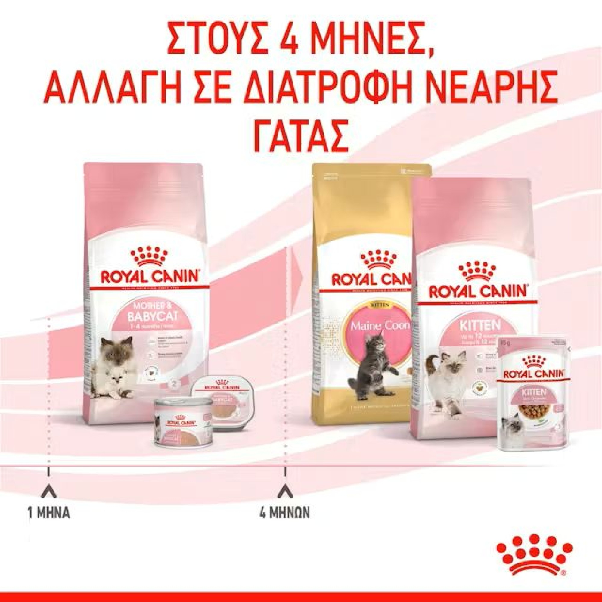Η ROYAL CANIN® Mother & Babycat είναι ειδικά προσαρμοσμένη για να καλύπτει τις υψηλές ενεργειακές ανάγκες της γάτας σας στο τέλος της κύησης και κατά τη διάρκεια της γαλουχίας. Έχει επίσης σχεδιαστεί για να υποστηρίζει την υγιή ανάπτυξη των νεαρών γατών που θηλάζουν ηλικίας έως 4 μηνών. Περιέχει ένα αποδεδειγμένο σύμπλεγμα που περιλαμβάνει βιταμίνες C και E για την υποστήριξη της υγιούς ανάπτυξης του ανοσοποιητικού συστήματος. Αυτή η φόρμουλα είναι εμπλουτισμένη με Ωμέγα-3 λιπαρά οξέα (DHA) για την υποστήριξη της ανάπτυξης του εγκεφάλου και την ενίσχυση της υγιούς όρασης σε νεαρές γάτες. Χάρη σε ένα συνδυασμό ωφέλιμων πρεβιοτικών (MOS) και εξαιρετικά εύπεπτων πρωτεϊνών, η ROYAL CANIN® Mother & Babycat βοηθά επίσης στην υποστήριξη μιας υγιούς ισορροπίας της εντερικής μικροχλωρίδας (χλωρίδα του εντέρου) για καλή πέψη. Η κροκέτα στο ROYAL CANIN® Mother & Babycat ενυδατώνεται εύκολα με νερό, δίνοντάς της μια εύγευστη υφή χυλού που είναι ιδανική για τον απογαλακτισμό των γατών και την υποστήριξη της ενυδάτωσης τους. Στο σύντομο χρονικό διάστημα των 16 εβδομάδων, οι νεαρές γάτες σας θα χρειαστούν μια δίαιτα που θα είναι ειδικά προσαρμοσμένη για να καλύπτει τις διατροφικές τους ανάγκες κατά την επόμενη φάση ανάπτυξης. Σε αυτό το στάδιο, μπορείτε να τα βοηθήσετε να μεταβούν σε δίαιτες ROYAL CANIN® KITTEN. Αυτή είναι διαθέσιμη ως ξηρή τροφής ή ως υγρή σε κομματάκια σε σάλτσα, ζελέ ή πατέ.